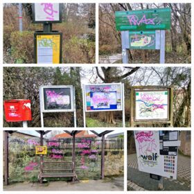 An vielen Stellen sind neue Schriftzüge und Tags aufgetaucht – auf Infotafeln, Buswartehäuschen, Verkehrsschildern und anderen Flächen.